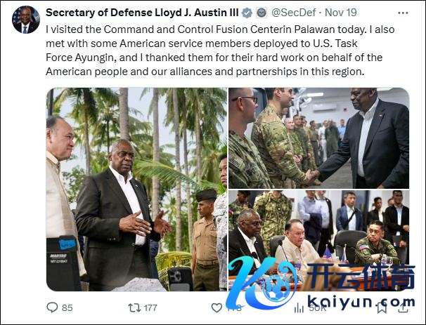 奥斯汀早前看望完菲律宾巴拉望岛的劝诱限度中心后,在X平台上发布了现场像片并附文写谈:“我今天参不雅了巴拉望岛的劝诱限度中心。我还会见了部署到好意思国和顺礁特遣部队的一些好意思国军东谈主,我感谢他们为好意思国东谈主民以及咱们在该地区的定约和伙伴关系所作念的致力于使命。”