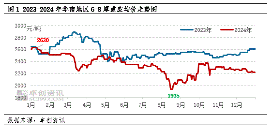 2024年华南地区废钢铁价钱走势合座呈现“高开低走”的趋势。具体数据来看,截止2024年12月30日,华南地区6-8mm重废均价为2220元/吨,较前年同期2610元/吨,减少390元/吨,降幅为14.94%。年内价钱高点出当今1月初,为2630元/吨;年内低点出当今8月中旬,为1935元/吨,凹凸点价差为695元/吨,较2023年502元/吨价差,波动区间进一步扩大。