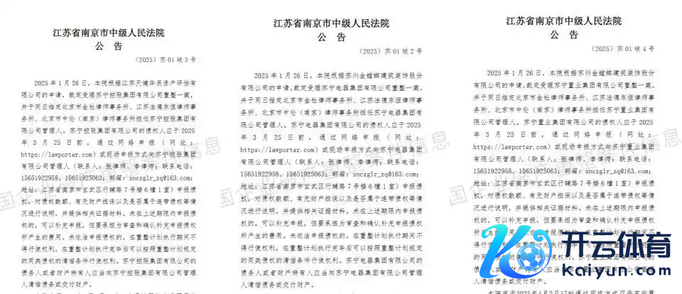 寰球企业收歇重整案件信息网发布苏宁电器集团有限公司、苏宁控股集团有限公司、 苏宁置业集团有限公司收歇重整案件信息与一债会公告,三家公司于2025年1月26日由南京中院受理收歇重整,案号辩认为(2025)苏 01 破 2 号、3 号、4 号。并将于4月2日召开上述被肯求重整公司第一次债权东说念主会议。