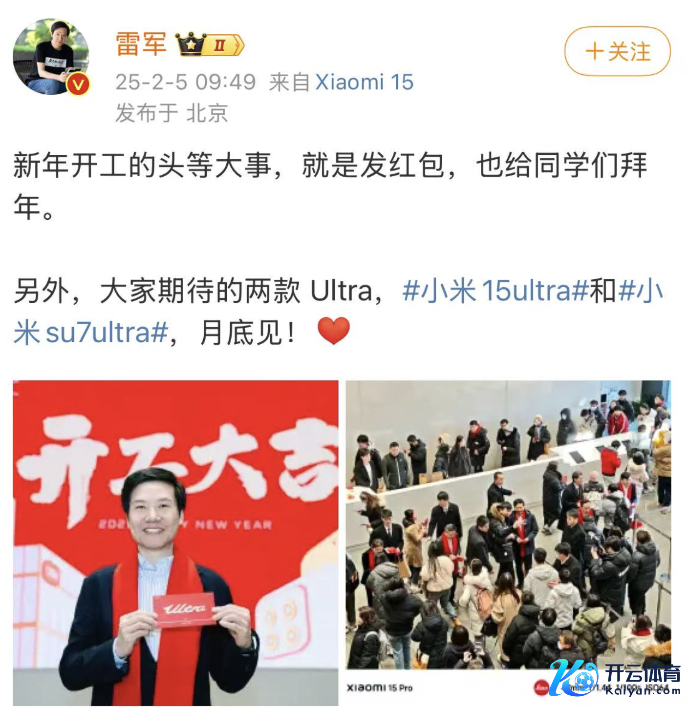 2月5日,春节复工首日,小米集团董事长兼CEO雷军在微博发文称:“新年开工的头等大事,便是发红包,也给同学们贺年。”同期晒出了贺年现场像片。此外,雷军还公布了小米两款Ultra的最新音问:“小米15ultra和小米su7ultra月底见!”同日早些时候,小米生态链总司理陈波在微博发文称:“共事说他抢到了雷总发的开工红包了,照旧个蛇年缅想币。”