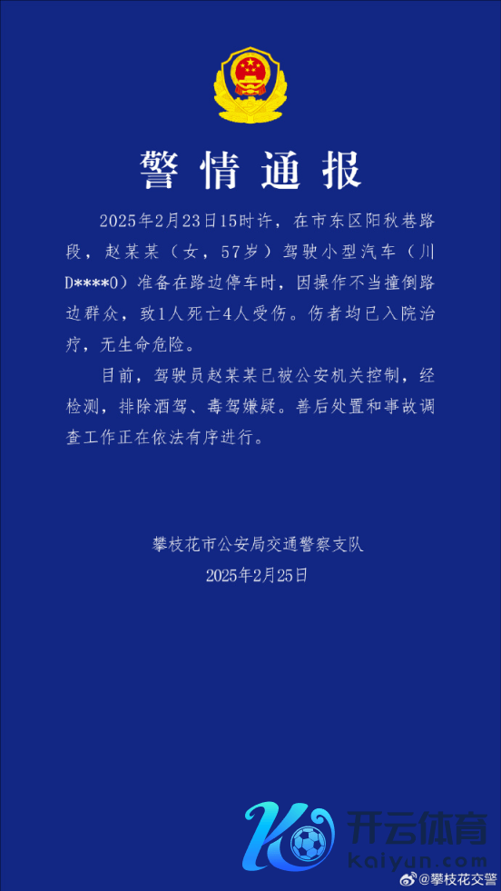 kaiyun官方网站小汽车因操作不当致1死4伤,攀枝花交警通报-kaiyun下载·开云体育(中国)官方网站 登录入口